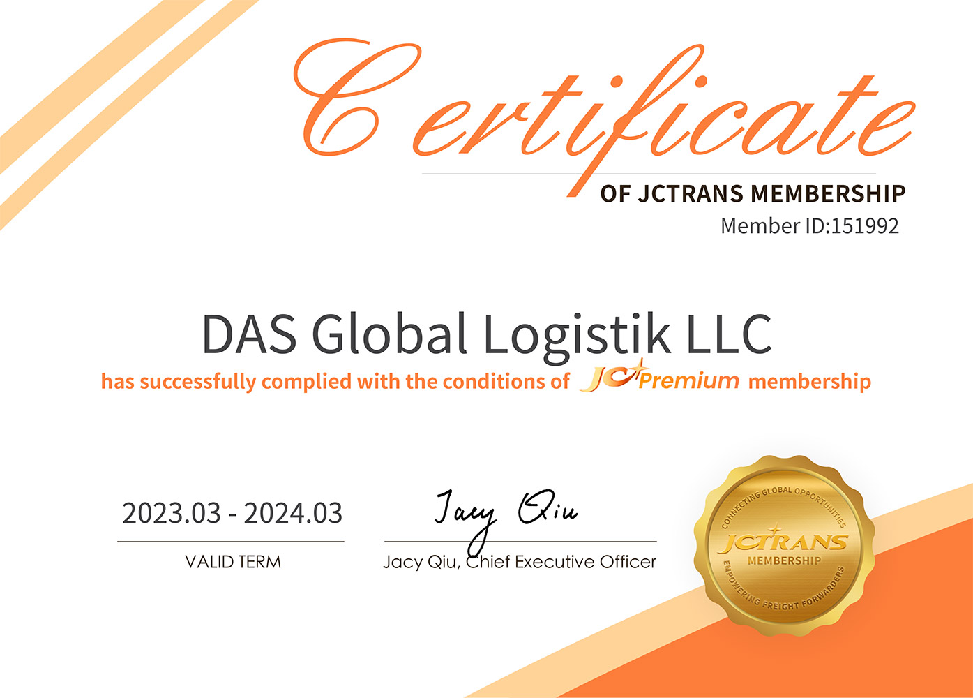 • Сертификат, подтверждающий членство в JCtrans по логистическим проектам на 2023-2024 гг. (Москва, Санкт-Петербург, Новороссийск, Екатеринбург, Владивосток)